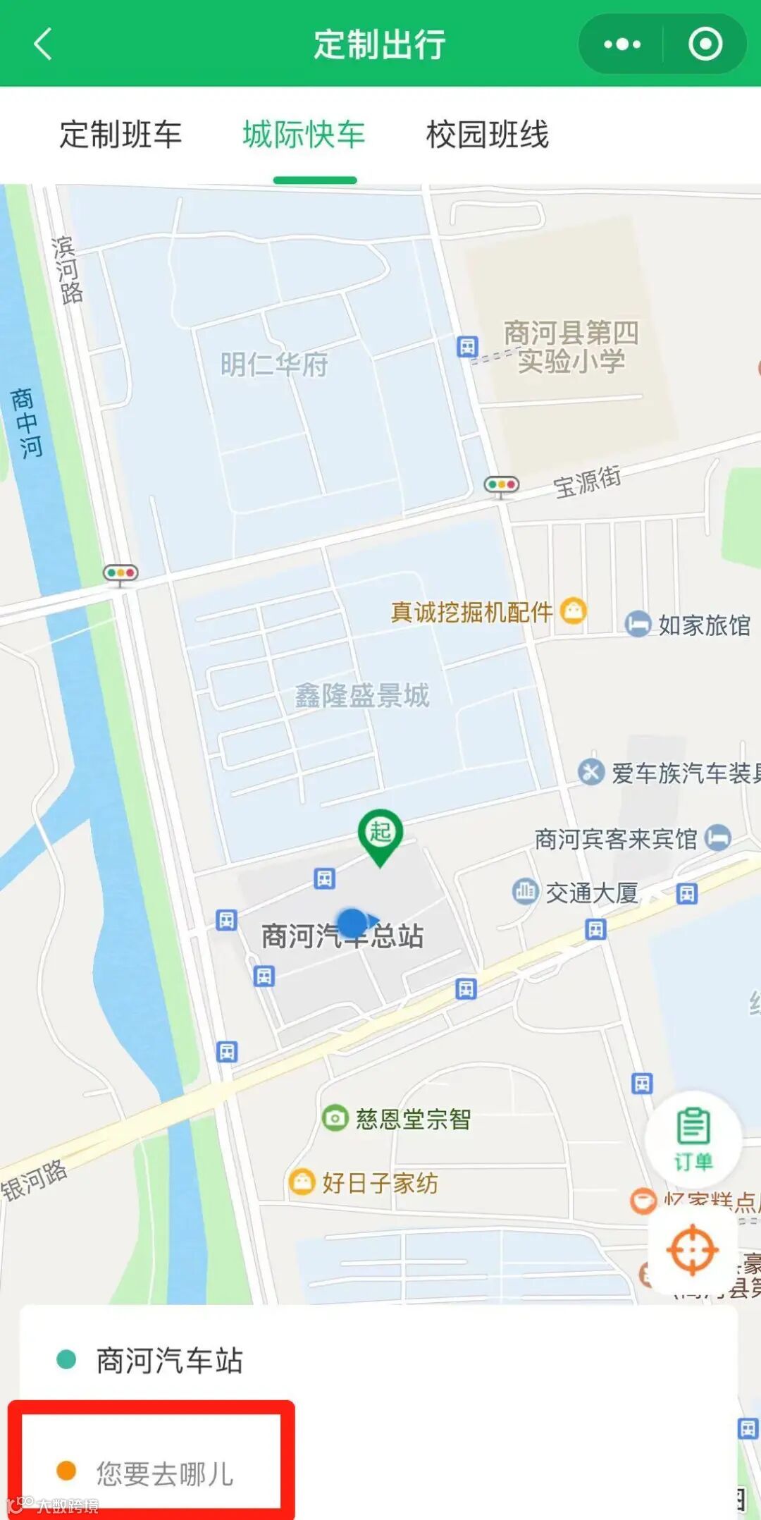 (2)线上购票,关注微信公众号“山商交运”&“商河县汽车站”,点击菜单栏底部【定制服务】,选择【定制约车】进入悦程小程序。