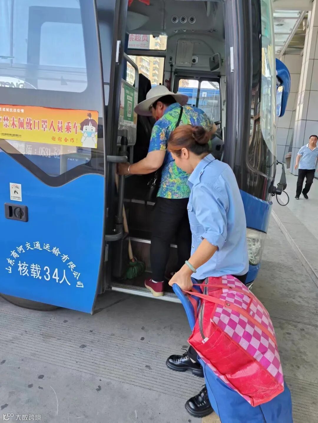 “您好,您行李这么多还这么重,我来帮您拿行李吧。”看到一位老人身体不便,拿着行李的旅客,工作人员立即赶上前去,热情的伸出援手,帮助旅客拿起行李,搀扶旅客坐上商河-济南的大巴车。