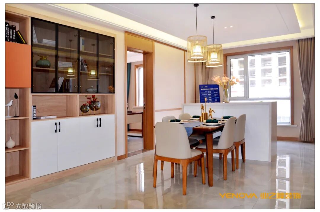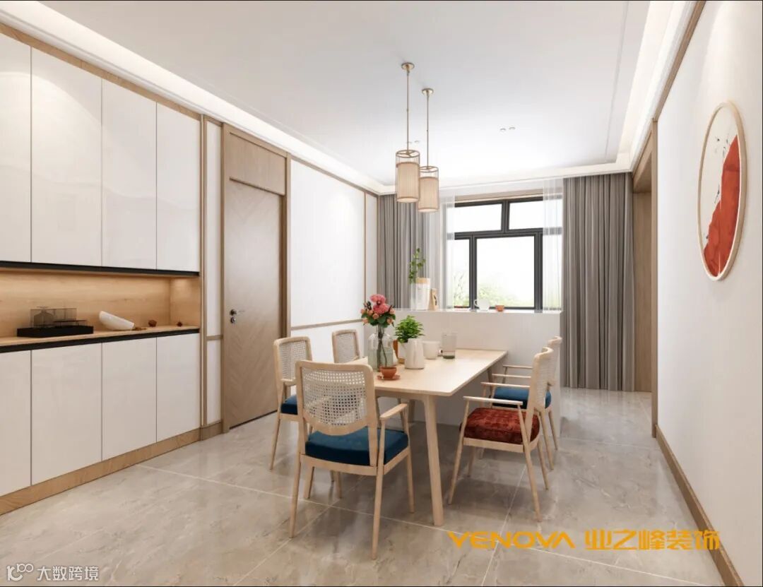 客餐厅家具采用原生态的颜色与餐边柜白色相呼应,开放式的布局,简约的餐桌椅,主人在这样的空间进餐的时候既放松又心情愉悦,幸福感满满。
