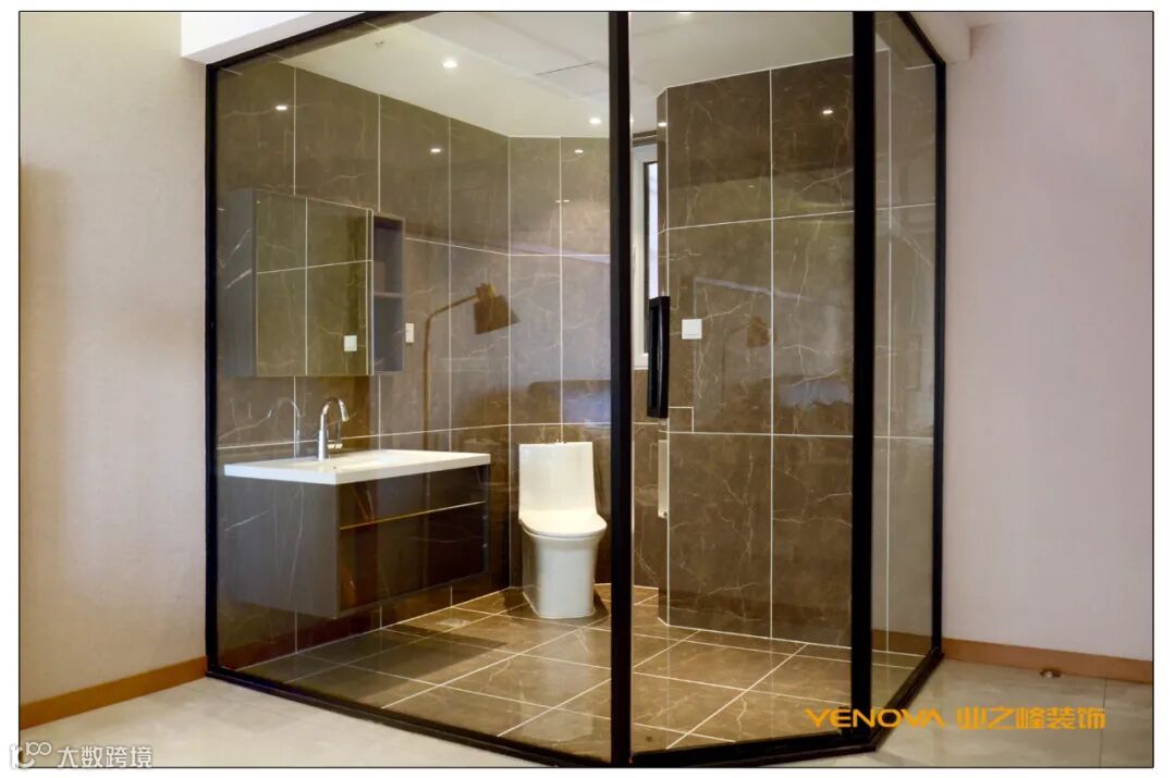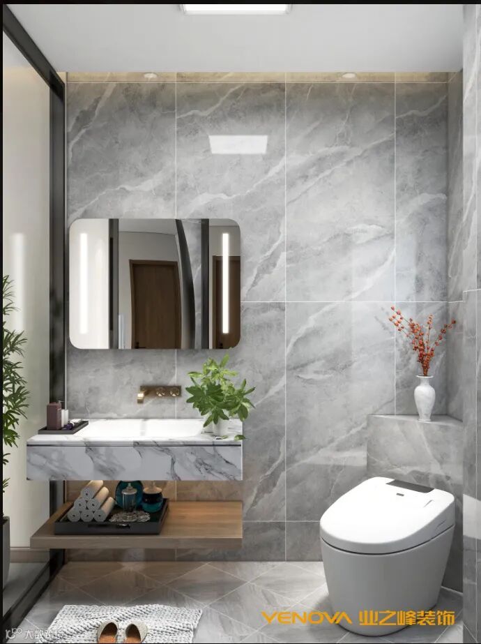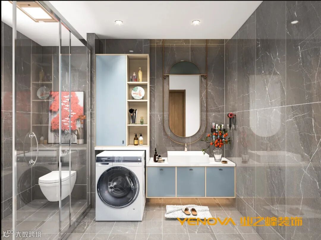 主卧里的主卫通透明亮,灰色格调彰显大气,悬空设计的洗手台既美观又符合人体功能学设计,洗手台下方单独的隔离板采用原木系木板设计,起到了一个“点题”的作用,又方便打理。