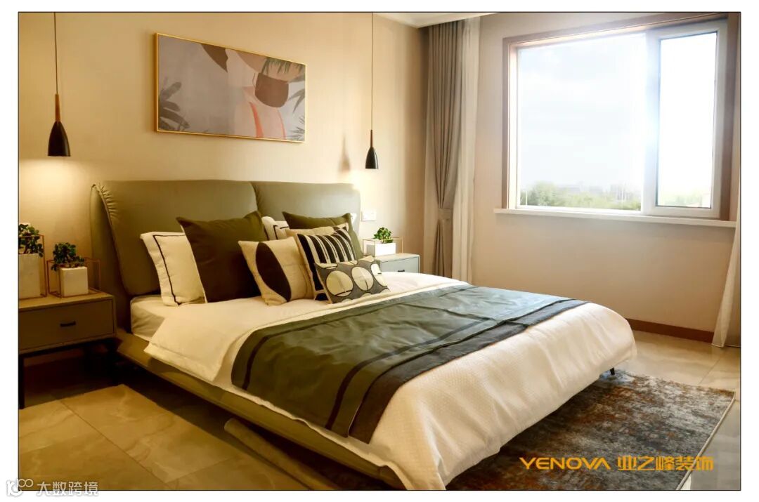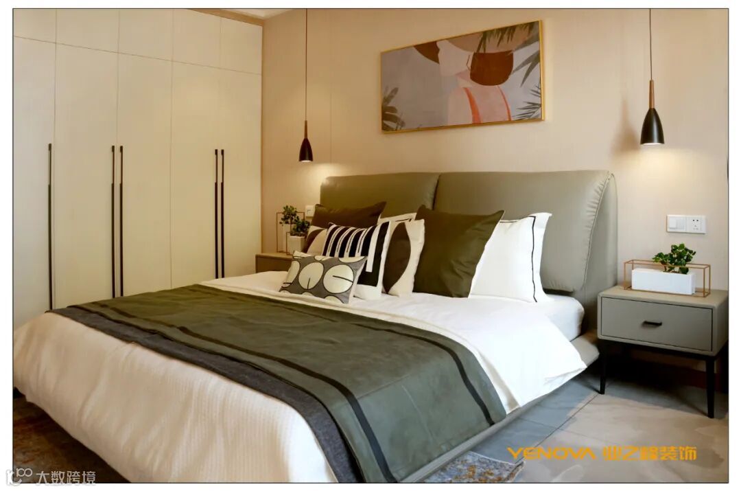 次卧继续沿用了素雅的色调,白色的柜体门板简单干净,宽大的半包围床头配上原木风的床体营造出温馨恬静的环境,使得空间节奏变得缓慢,体现出自由随意、静怡安逸的气息。