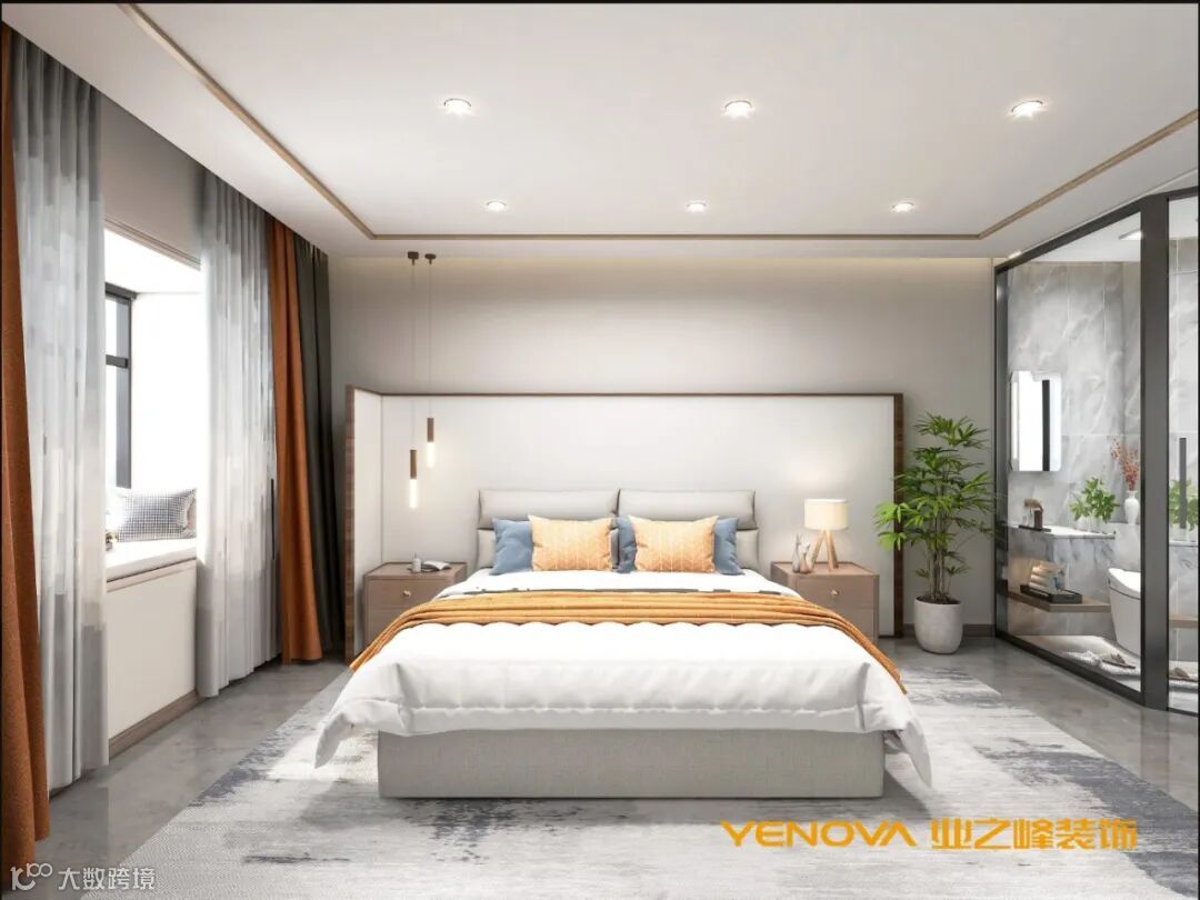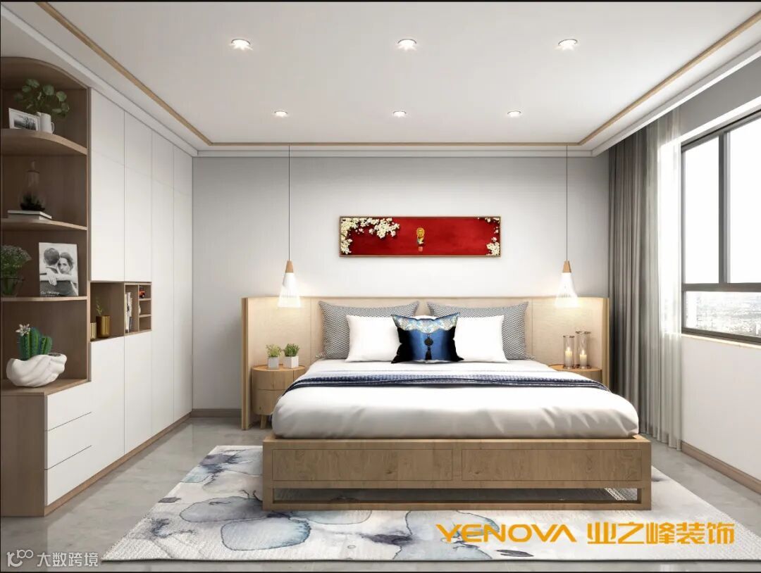 主卧也做了吊顶边缘原木条框设计搭配现代风格的床头灯具,透明玻璃隔开的主卫设计既温润又私密使得整个卧室更具有通透感!对于活在都市森林中的我们来说,日式家居环境所营造的闲适写意、悠然自得的生活境界,也许就是我们所追求的。