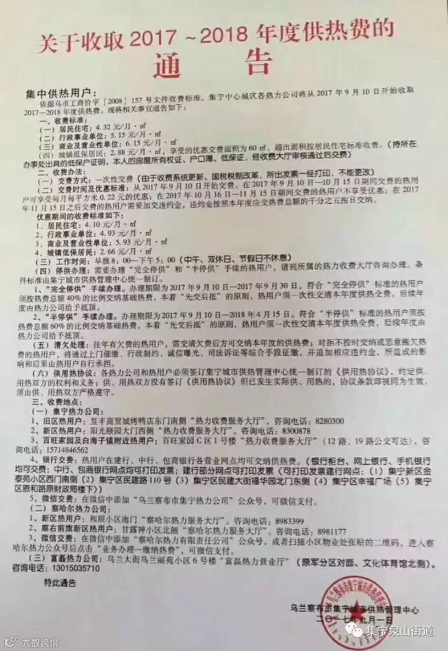 依据乌市工商价字[2008]157号文件,集宁中心城区各供热公司将从2017年9月10日开始收取2017—2018年度供热费,现通告如下: