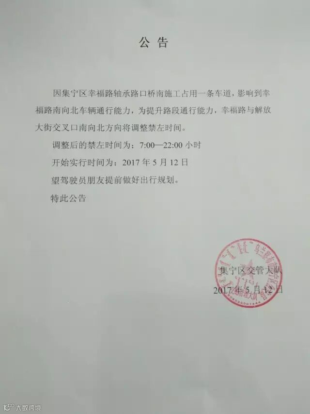 因集宁区幸福路轴承路口桥南施工占用一条车道,影响到幸福路南向北车辆通行能力,为提升路段通行能力,幸福路与解放大街交叉口南向北方向将调整禁左时间。
