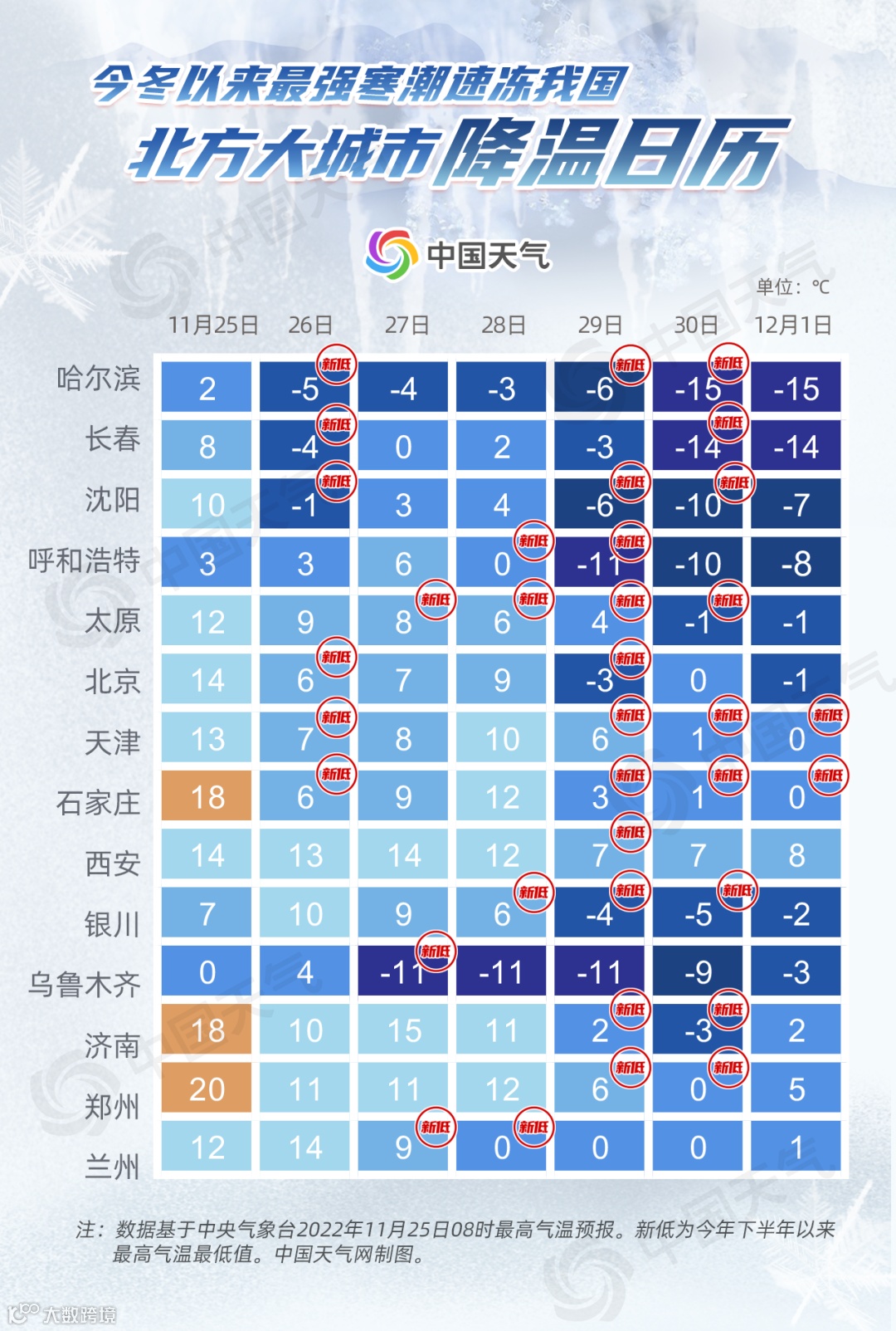 此轮寒潮影响范围广泛、降温剧烈,中东部大部气温降幅都是10℃起步,多地超过20℃,西北地区东部、华北、东北多地最高气温甚至可能会打破11月的最低纪录。