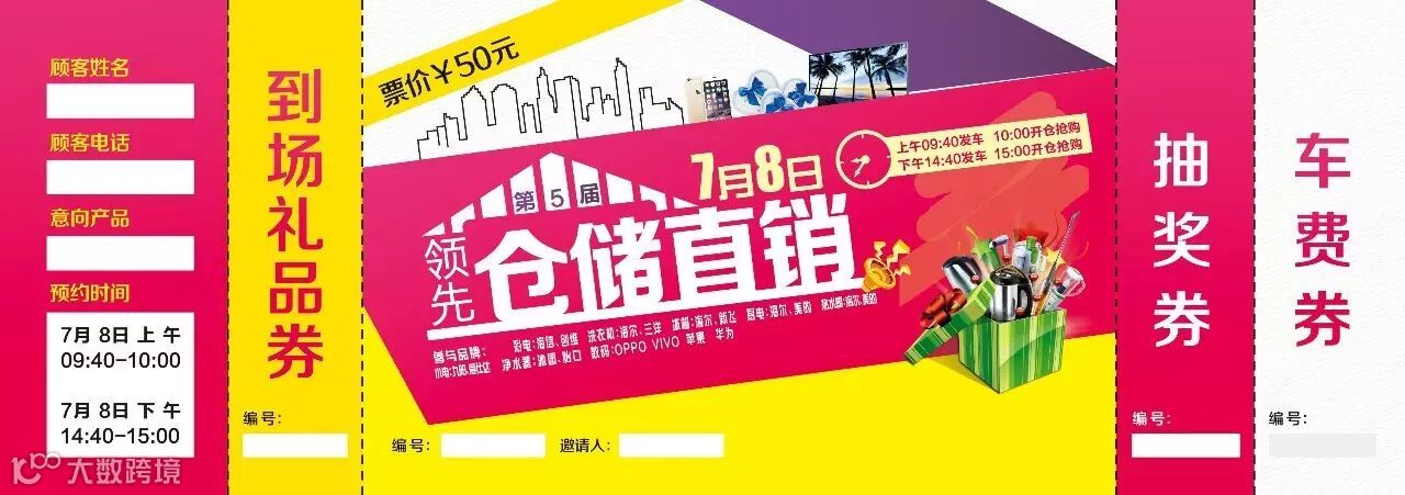 顾客凭“仓储门票”在7月8日上午9:40或下午14:40到幸福广场领先商场门口乘坐“免费大巴”,新区顾客到体验店乘坐商务车,再凭“仓储门票”到领先物流园区入场参加“仓储工厂直销”活动。