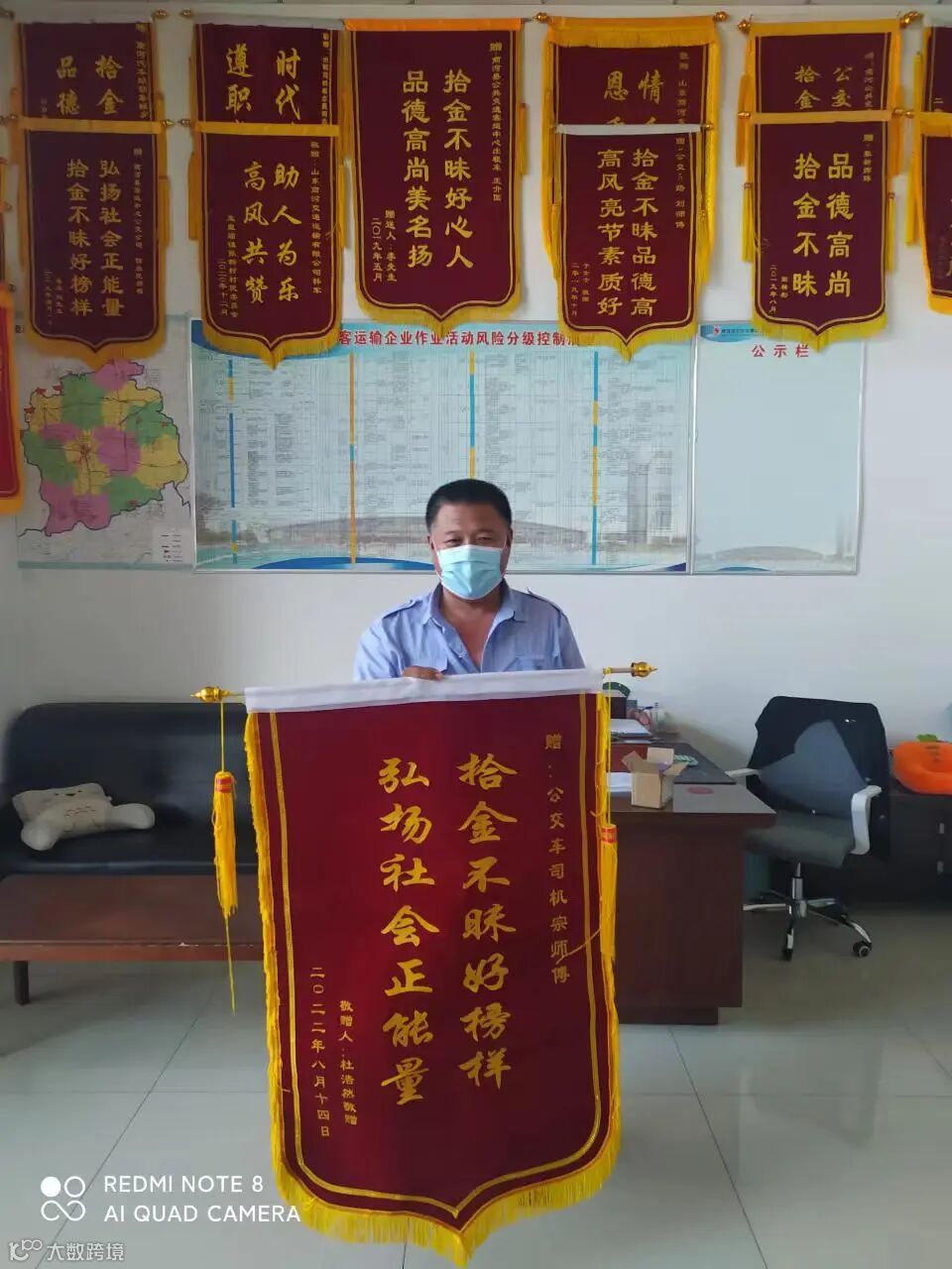 8月14日傍晚,由商河发往贾桥苏的公交车宗恒明师傅在收车后清理卫生时,发现车上有乘客遗留的手机一部,马上与城乡公交办公室工作人员联系寻找失主,刚把手机交到办公室,失主杜先生就打来电话寻找,由于当时手机电量耗尽关机,办公室工作人员急忙寻找适合配置的充电器,充着电等待乘客的再次来电。大约10分钟,乘客再次打来电话,工作人员告知乘客手机正在城充电,可以到商河汽车站城乡公交办公室领取。因乘客手机信息较多,同时也需要联系客户,所以城乡公交办公室留值班人员和宗师傅等待杜先生交还手机。对此杜先生特别感动,特意送来锦旗表示感谢。