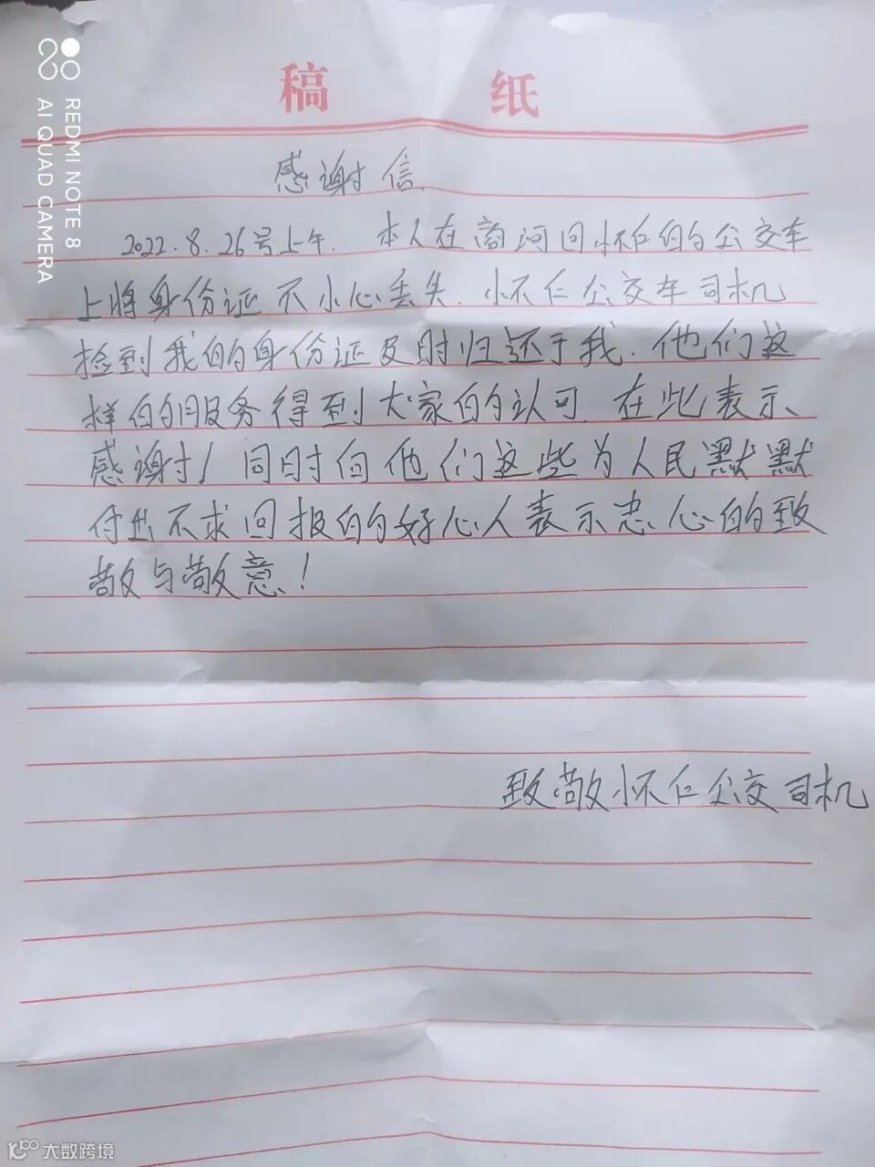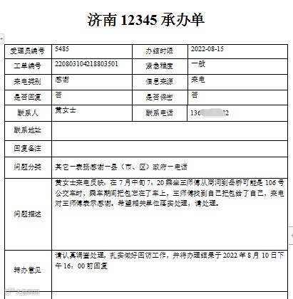 7月中旬,黄女士在乘坐白桥106路公交车时,到达岳桥下车时,不小心将包落在了公交车上,王师傅收车后,对车辆进行例检发现包后及时归还给黄女士,黄女士对此表示非常感谢,特意来电致谢。