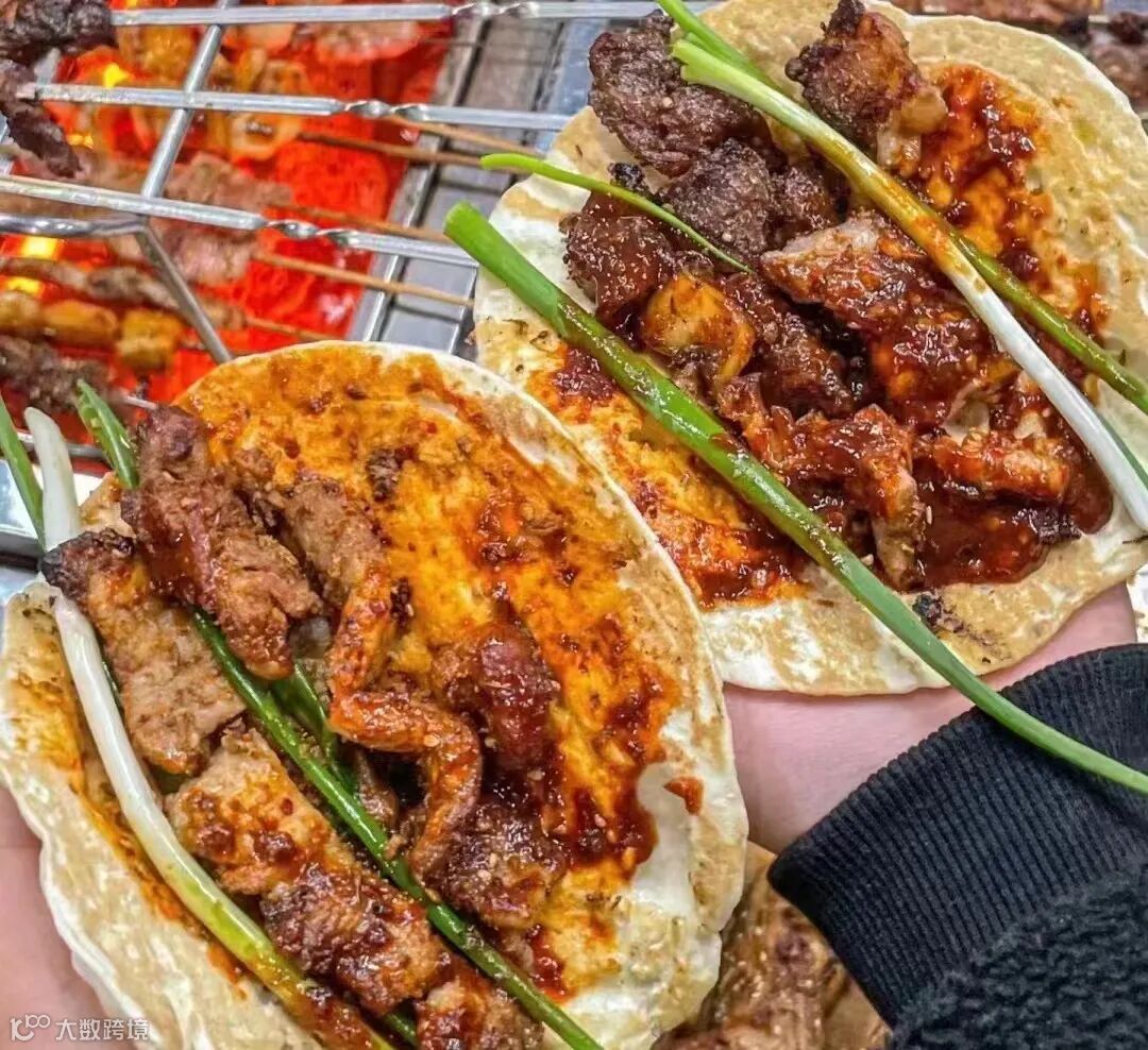 此外淄博烧烤有一种独特的吃法等到肉串开始冒油把串上的肉用小饼一包加入小葱再放上自己调配的辣酱等蘸料味道堪称一绝。