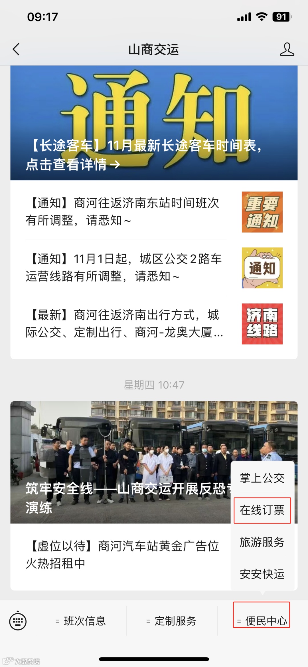 1、关注微信公众号【山商交运】、【商河县汽车站】,选择便民中心-在线订票