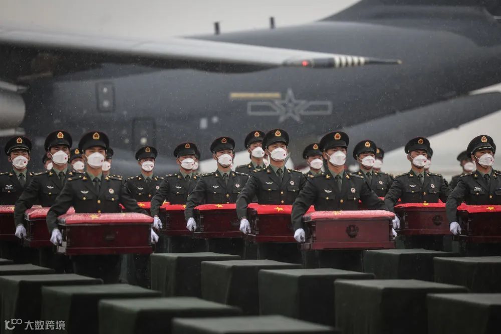 2022年9月16日,在沈阳桃仙国际机场,礼兵将殓放志愿军烈士遗骸的棺椁从专机上护送至棺椁摆放区。新华社记者 潘昱龙 摄
