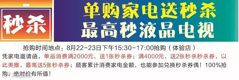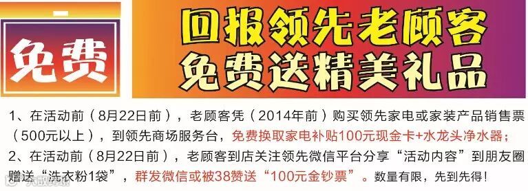 8月22-23日“领先厨房电器节,送电费、话费、网费”…… 油烟机9元、燃气灶9元、电磁炉9元、烤箱9元、电水壶9元、多用锅9元,凭家电邀请函到体验店秒杀抢购!