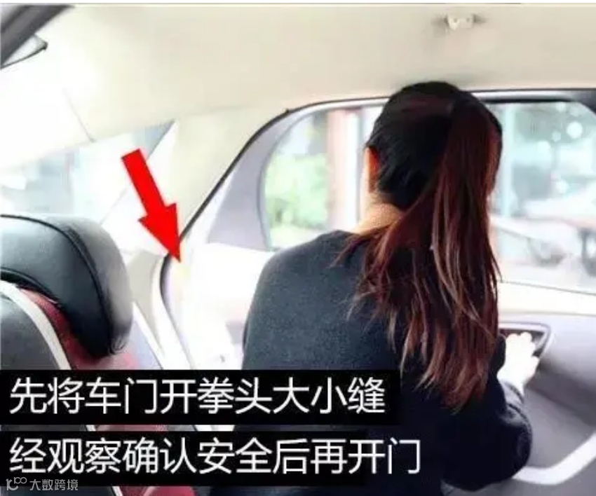 ▶ 驾驶人应提前提醒乘车人,特别是后排乘客,要先看清车辆前后左右的来往行人、车辆情况,确认安全后方可开门下车。