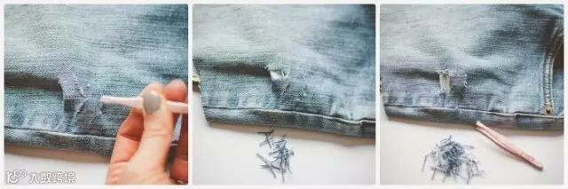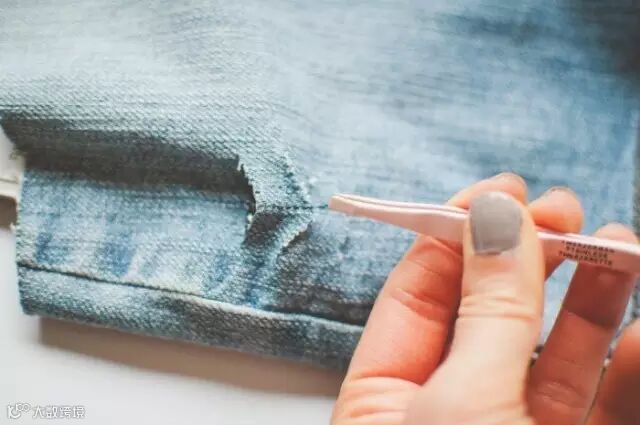 剪开观察你会发现牛仔裤是由蓝色线和白色线组合成的,用镊子夹住一个垂直蓝线,并轻轻将其拉出,抽取所有的垂直蓝线,仅露出水平的白色线,这样就做好一个破洞~