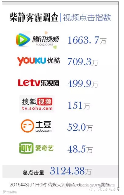 截止2015年3月1日零点,传媒大观察统计了优酷、腾讯视频等各大主流视频网站数据,该调查视频点击率已经突破3100万次。