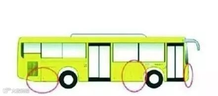 上图中,红色圆圈标示出的三个位置,都是公交车辆的视线盲区。