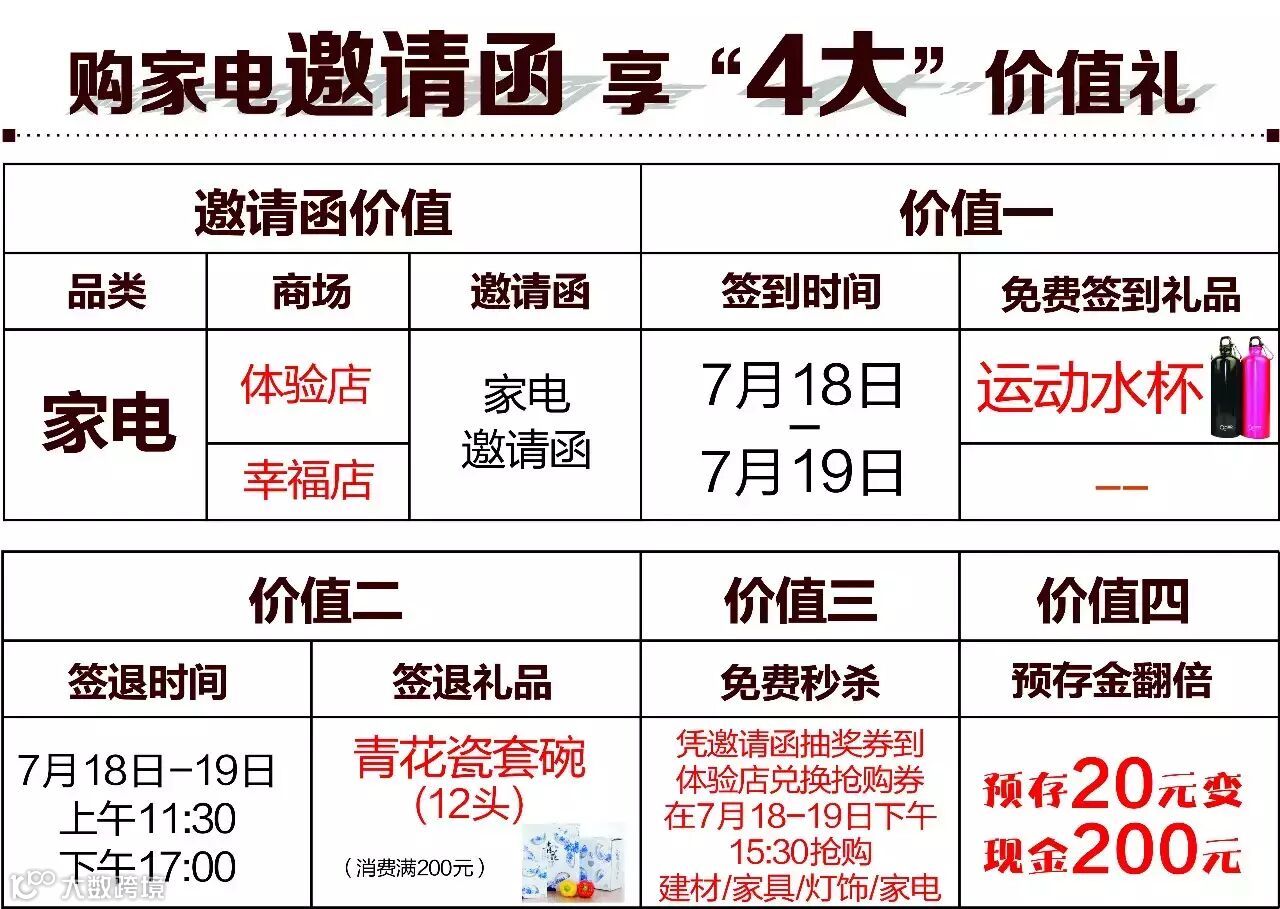 4.预存翻倍:顾客在7月18-19日凭家电邀请函到服务台换取200元家电购物卡,可以到商场选购家电产品