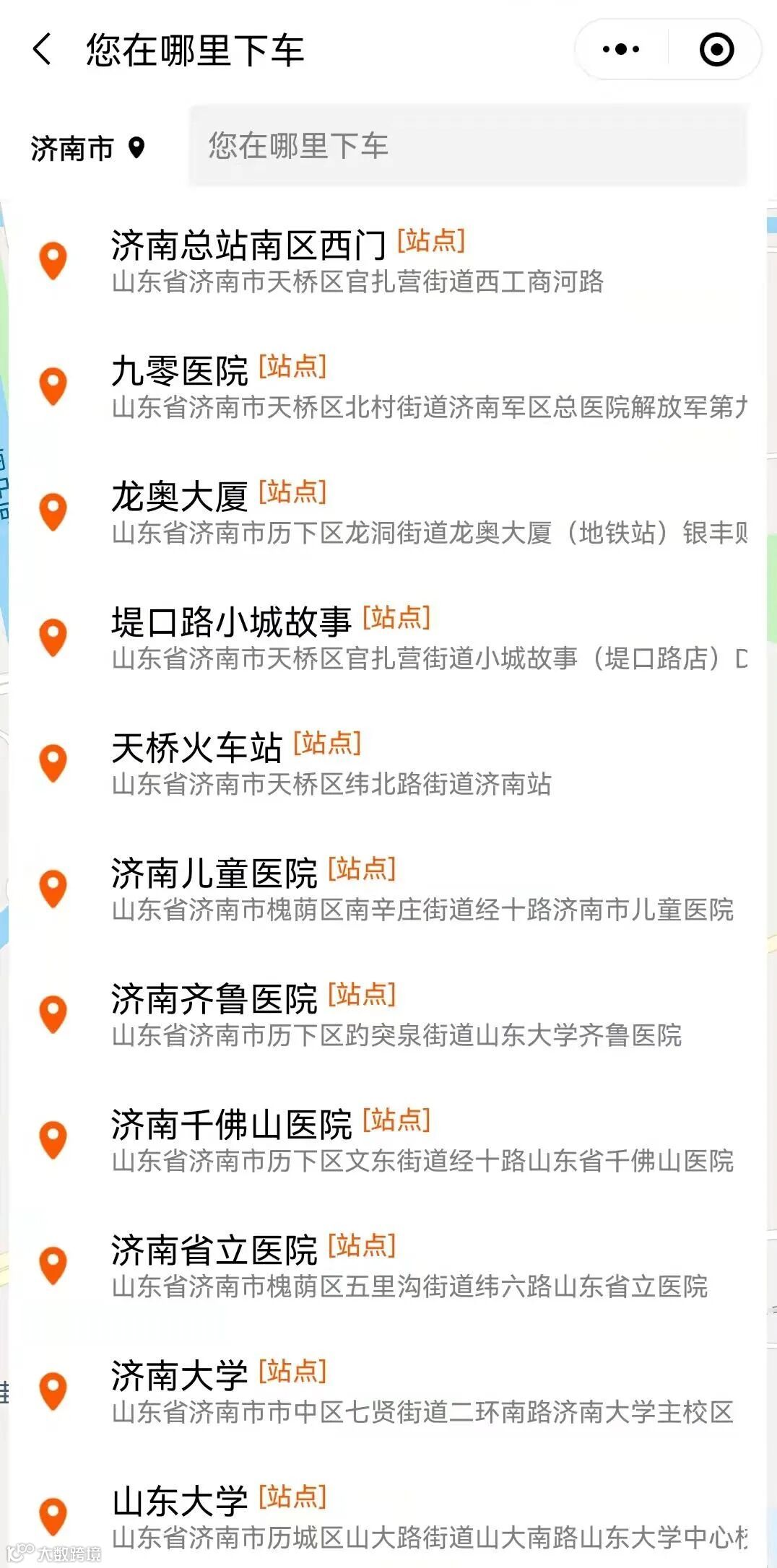 济南站点:济南西客站、济南遥墙机场、济南高铁东站、九零医院、总站南区、堤口路小城故事、济南天桥火车站、儿童医院、齐鲁医院、干佛山医院、省立医院、济南大学、山东大学、山东财经大学、山东师范大学、燕山立交、龙奥大厦、省立东院等等。