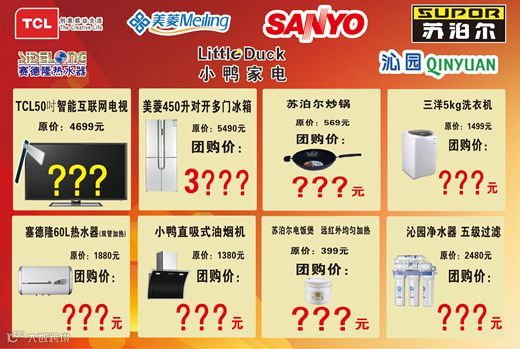 TCL彩电/美菱冰箱/三洋洗衣机/苏泊尔小家电/小鸭灶具、油烟机/赛德隆热水器/沁园净水器