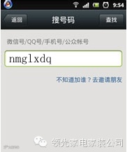 第二步:然后再点击搜号码选项,此时您可以通过输入微信号,QQ号,手机号或者公众账号(比如:nmglxdq),来进行好友或者公众平台的查找;