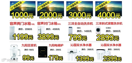 康佳电视、容声冰箱、三洋洗衣机、美的热水器、烟灶、九阳小家电、沁园净水器;