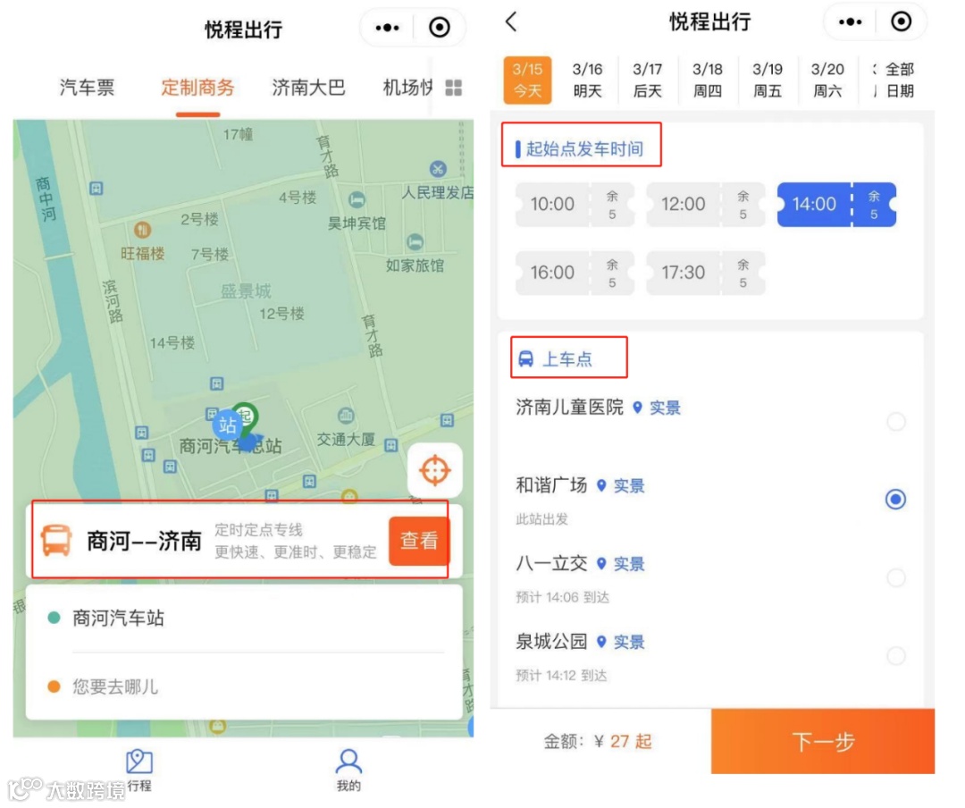 ⑤选择“乘车日期”--“起始点发车时间”--“上下车点”--添加“乘车人”--提交订单即可。