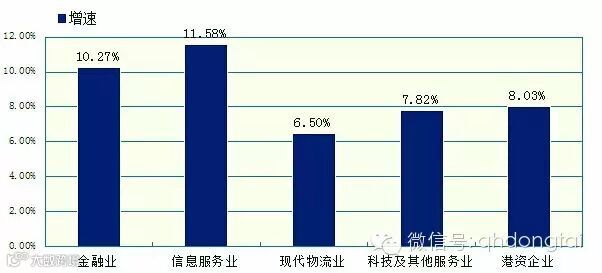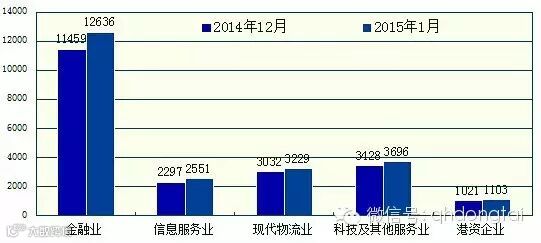 与去年数据(截止2014年12月31日)相比,今年1月份,前海金融类企业新注册1177家,增长10.27%;信息服务业企业新注册254家,增长11.58%;现代物流业企业新注册197家,增长6.5%;科技及其他服务业企业新注册268家,增长7.82%。以上数据表明,在现阶段,入驻前海的企业仍以金融企业为主,而增长速度最快的为信息服务业企业,其他各现代服务业企业也均有较大幅度的增长,体现入驻前海企业呈现全面快速发展。