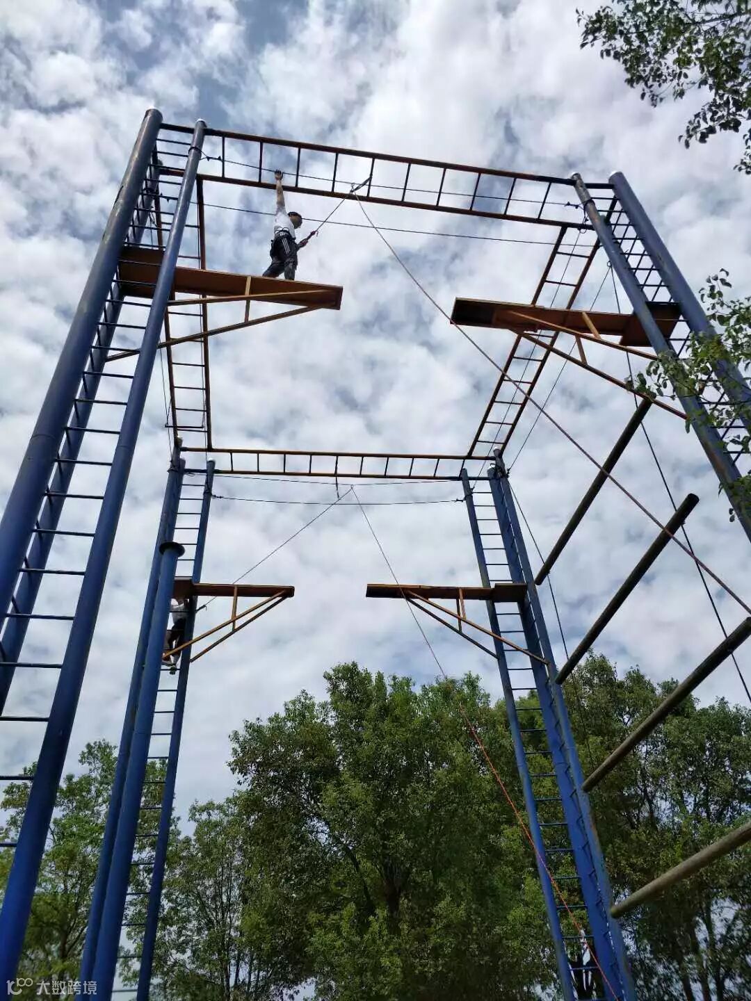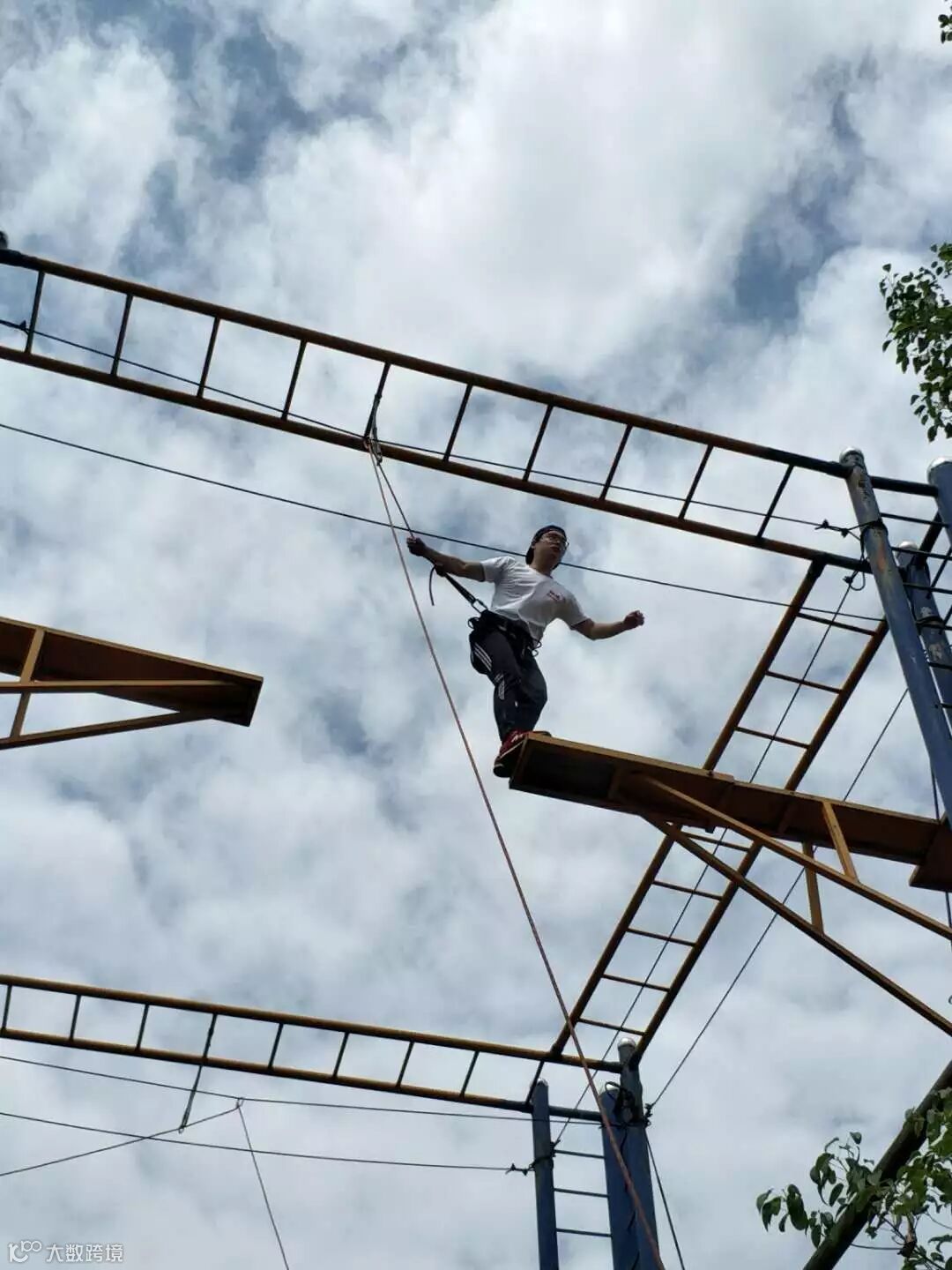 高空断桥这个项目,就是在距离地面高度为10米的高空,搭起了一座独木桥,而这个桥的中间却是断开的,间距1.2米,要求队员爬上这10米的高空后,从断桥的一侧迈到另一侧,再由地面安全员放松安全绳,从高空滑落地面。