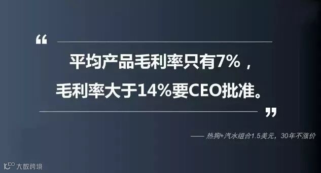 与此同时其它的所有超市和便利店,从国际巨头Walmart、家乐福,到遍布东亚的711,到把红旗插满四川的红旗连锁,都在追求毛利润率不断增长。只有Costco整天在想,如何可以少赚一点?今年毛利10%,明年能不能9.5%,后年能不能进一步降低到9%?在能够打平运营费用税费的条件下,毛利润率越低越好。在全球的Costco里都藏着一个14的神秘数字,意思是任何商品定价后的毛利润率最高不得超过14%。