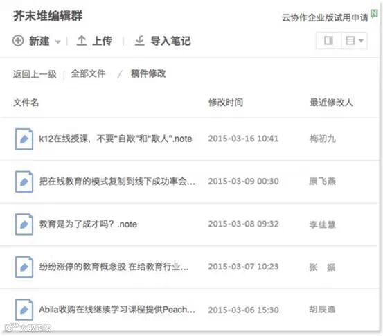 芥 末堆是一支迅速成长的创业团队,让新的小伙伴快速上手很重要。当时有名新伙伴是传统IT行业记者出身,对在线教育领域并不熟悉。但把她加入云协作编辑群之 后,她便可以一目了然的看到,团队此前积累的采访记录和稿件,用有道云协作有助于工作内容有序和完整的存储,这对于新加入小伙伴在业务上快速地了解团队和 工作内容很有意义。