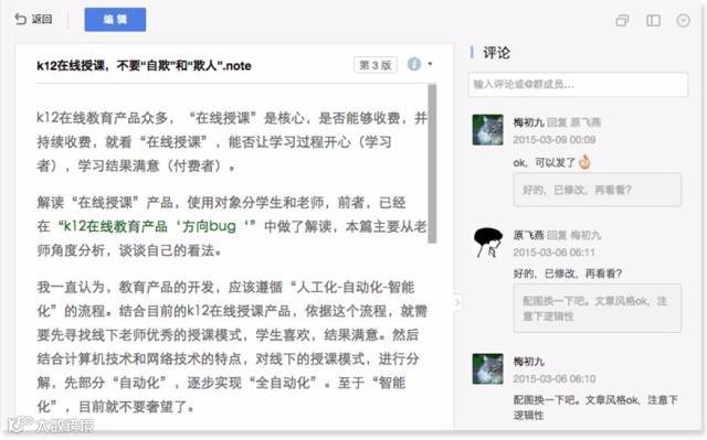 用 QQ或者微信沟通的问题是,关于工作的讨论经常会被无关的闲聊淹没,而且很难沉淀下来。比如春节期间,微信群里发一个红包引起的无关讨论,就足以淹没之前 所有和工作相关的重要讨论。用有道云协作可以针对每篇文档发表评论,有价值的讨论更容易沉淀。围绕稿件的重要讨论,能在右侧评论栏直观的保存下来,并随时 查阅翻看。