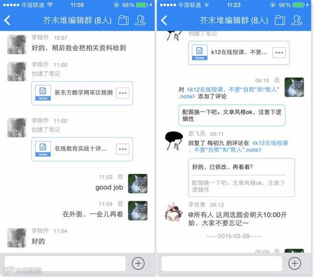 作为一支初创团队的创始人,梅初九每天在办公室的时间并不多。她经常要用手机跟进团队的工作动态,比如谁上传了新稿件,团队成员有什么讨论等等。使用有道云协作,梅初九可以随时随地掌握团队工作动态。
