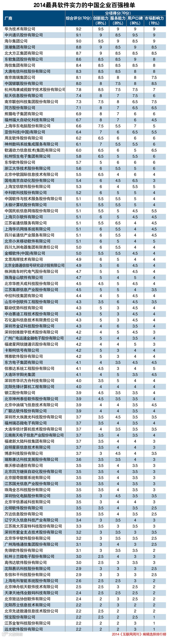 以下是《互联网周刊》发布的2014最具软件实力的中国企业百强榜单,借鉴2014年中国软件业务收入,融入了创新能力、服务能力、用户口碑、市场影响力这四个维度,并对其进行综合实力排名。通过表单不难看出,百强软件企业主要聚焦在北京、广东、上海、辽宁、福建、山东、浙江、江苏等地区。
