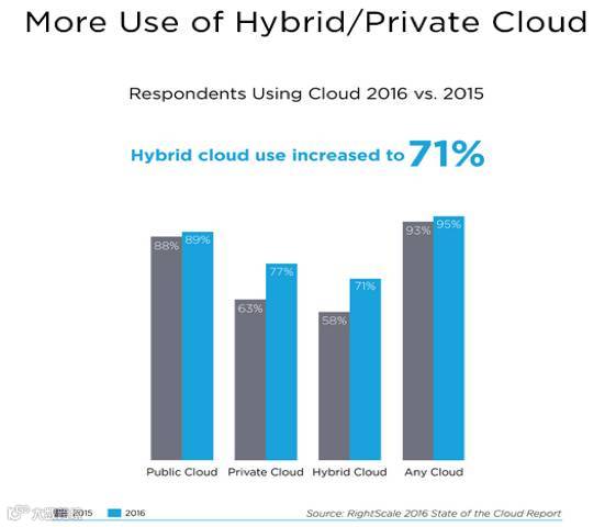 要解决数据安全问题,主要可以通过两个方式。一是企业自己搭建私有云,免除被云服务商“偷窥”的可能性。据2016年,RightScale调查结果显示,由于数据安全原因,私有云的使用比例较2015年增长了14%,而公有云得使用比例仅增长1%,而混合云的使用随着私有云的普及,上涨至71%。