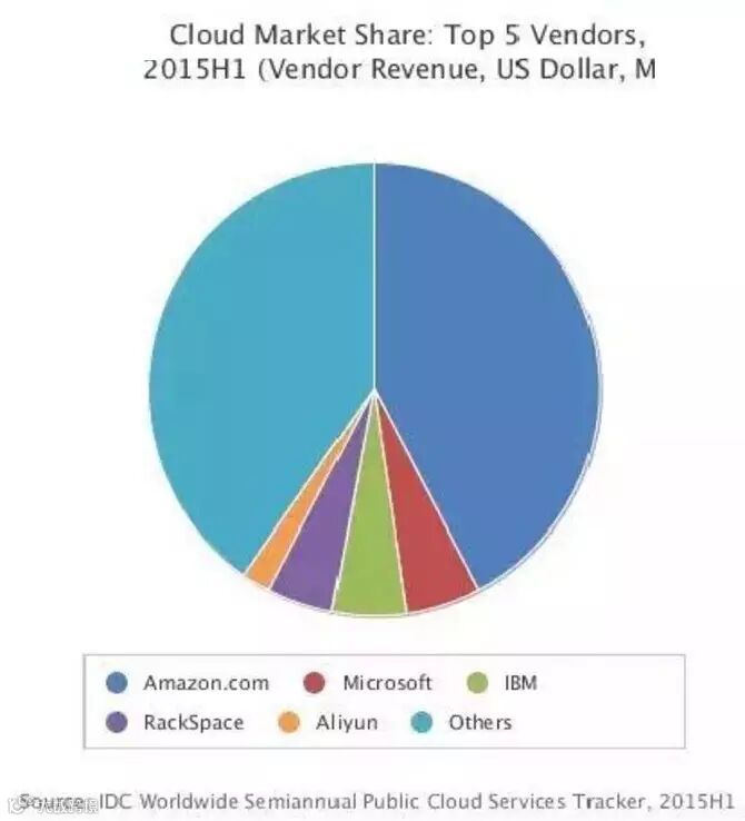 如果光从产品出发,那么外资云更胜一筹。一来,外资云对用户需求的深度与广度的认知水平极高,加之多年的技术积累,使其云服务在稳定性、扩展性、安全性等各方面性能上,都远胜于国内云服务。据IDC统计显示,截至2015年上半年,全球公共云计算市场占有率最高的前五家服务商分别为亚马逊、微软、IBM、RackSpace和阿里云。从图中我们不难看出,国内云服务巨头阿里云在亚马逊的AWS面前,就是小巫见大巫。