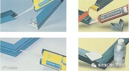 就是 相同的材料,在不同的生产厂家,制作工艺也是有着巨大差距的,一些小的门窗厂家在组装门窗时,他们仅仅限于把门窗组装起来,只要牢固就可以了。而正规大厂在组装门窗时,除了牢固美观以外,在组装时,先要在铝材的截面涂抹组角胶,组角完成后,要对组角内部进行注胶,用组角胶将角码与型材之间的缝隙填充起来,使得他们之间成为一个整体,即连接得更牢固,又能防止组角部位漏雨,同时在气密性上又上一个台阶。如下图: