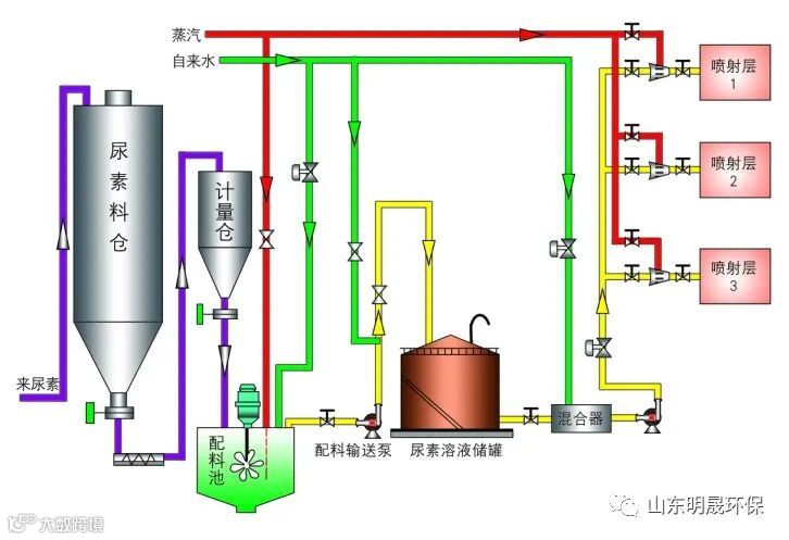 各喷入组设有多个喷入器,每个喷入组设有流量调节阀门和流量计量设备,用以计量和控制本组喷入炉膛的尿素流量。如果尿素为固体,则需要一个尿素溶液制备系统,将固体尿素和除盐水在溶解罐内混合,为了保证尿素溶液供应的连续性,通常配备2个溶解罐,尿素在第一个罐内溶解后,注入第二个罐进行中间储存和缓冲,最后通过水泵抽出后送往锅炉烟道。