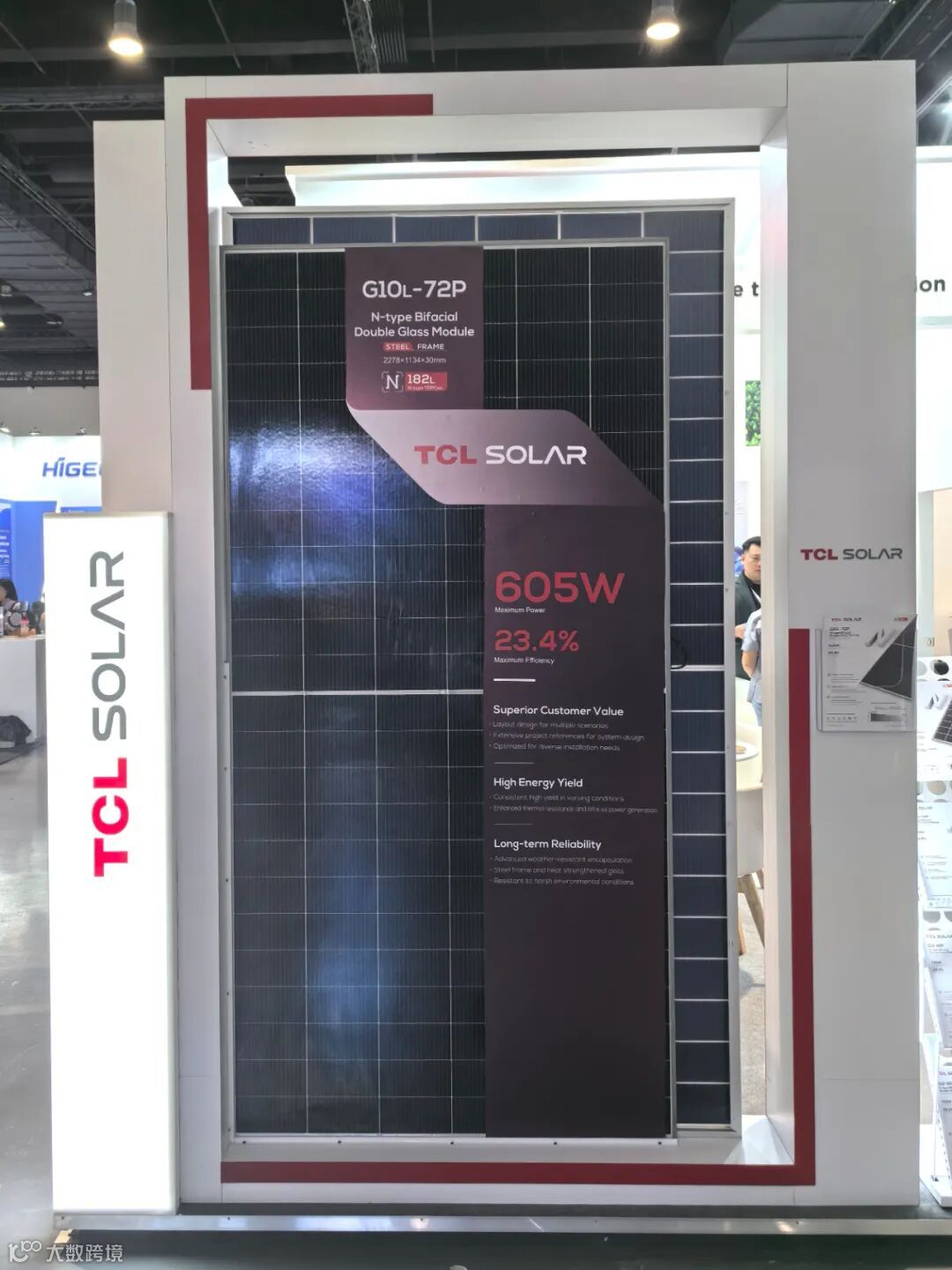 本次展会,TCL Solar还带来了专为菲律宾等东南亚极端台风气候打造的钢边框G10L-72P TOPCon组件。相较于传统边框组件,该产品的抗风压强度提升50%,采用高强度钢边框,抗风压能力正面可达5400Pa,背面2400Pa,无惧台风侵袭;同时,605W的超高输出功率,23.4%的组件转换效率,搭配N型TOPCon技术低衰减特性,首年衰减率低于1%,线性衰减保证年均不超过0.4%。这将重构组件可靠性标准,为客户提供全生命周期的价值保障。