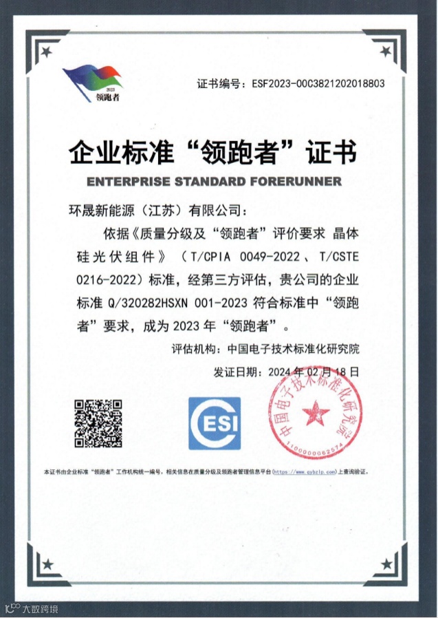 近日,由国家市场监督管理总局、国家发改委、科技部等八部门联合指导,中国标准化研究院组织的2023年中国企业标准“领跑者”评选结果公示,环晟光伏旗下环晟新能源(江苏)凭借领跑同类产品的质量水平以及高标准要求成功入选中国光伏组件领域企业标准“领跑者”榜单。