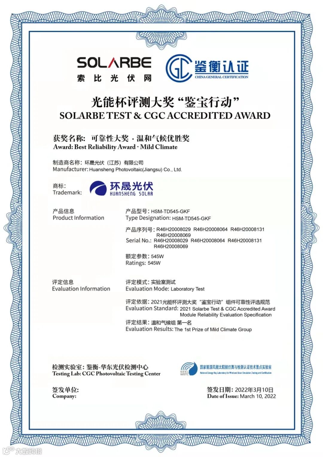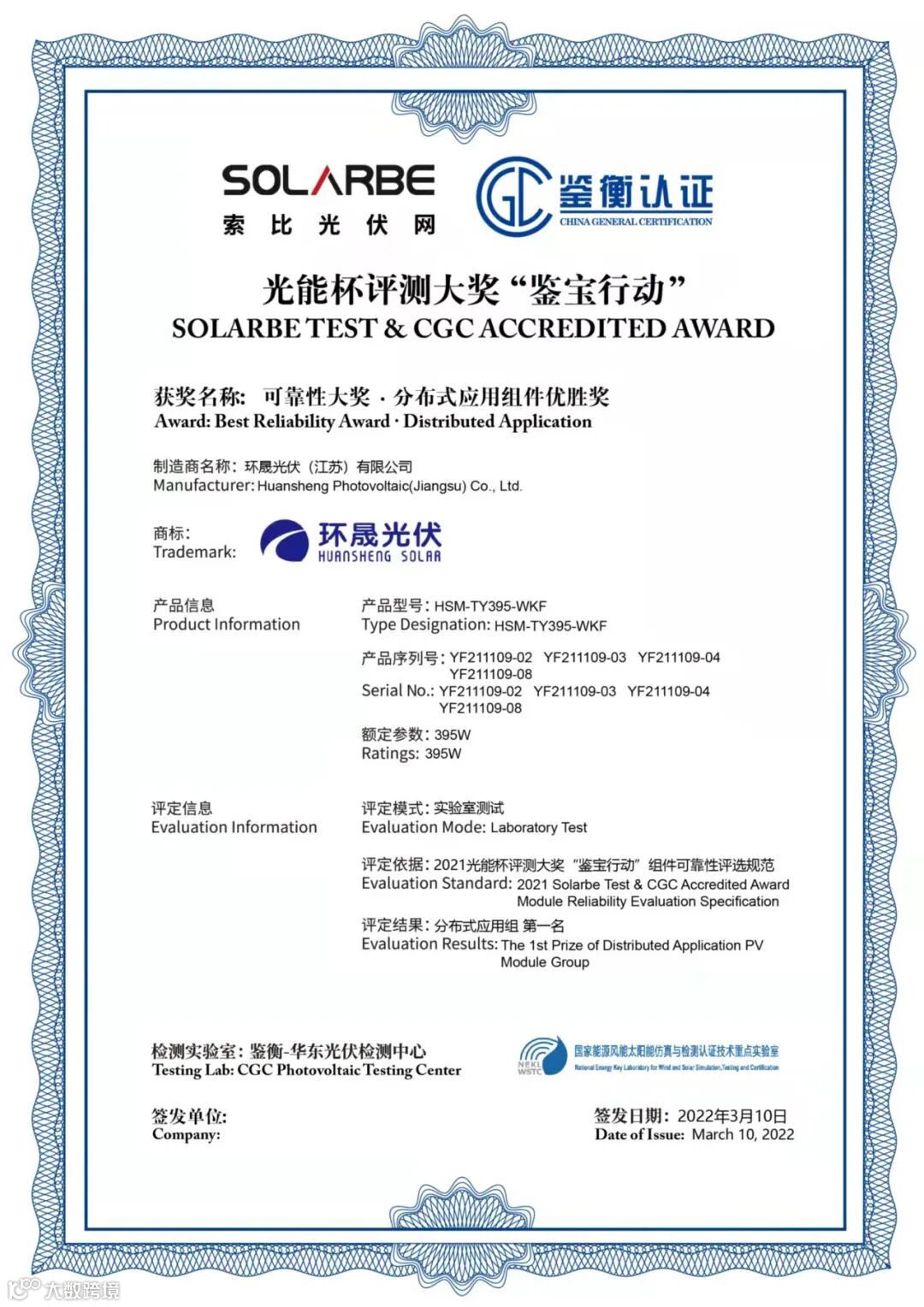 3月10日,2021年“光能杯”SOLARBE TEST评测大奖颁奖典礼在广东顺利举行,本次活动由索比光伏网联合权威第三方检测认证机构鉴衡认证中心联合举办,环晟光伏产品经层层严苛筛选,顺利通过可靠性测评,夺得2021年SOLARBE TEST评测大奖温和气候优胜奖及分布式应用组件优胜奖双料大奖!