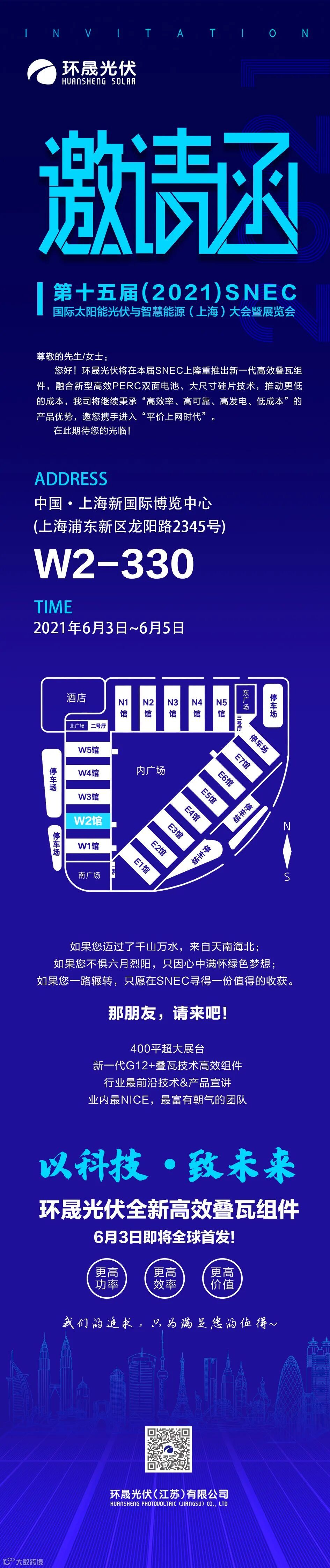 导读:中国·上海新国际博览中心 6月3日-5日 W-330 展位环晟将携全新一代高效叠瓦组件隆重亮相,欢迎来观~