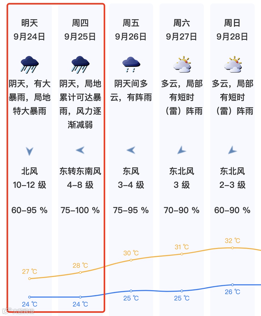 24日:阴天,有大暴雨,局地特大暴雨,气温24-27°C;