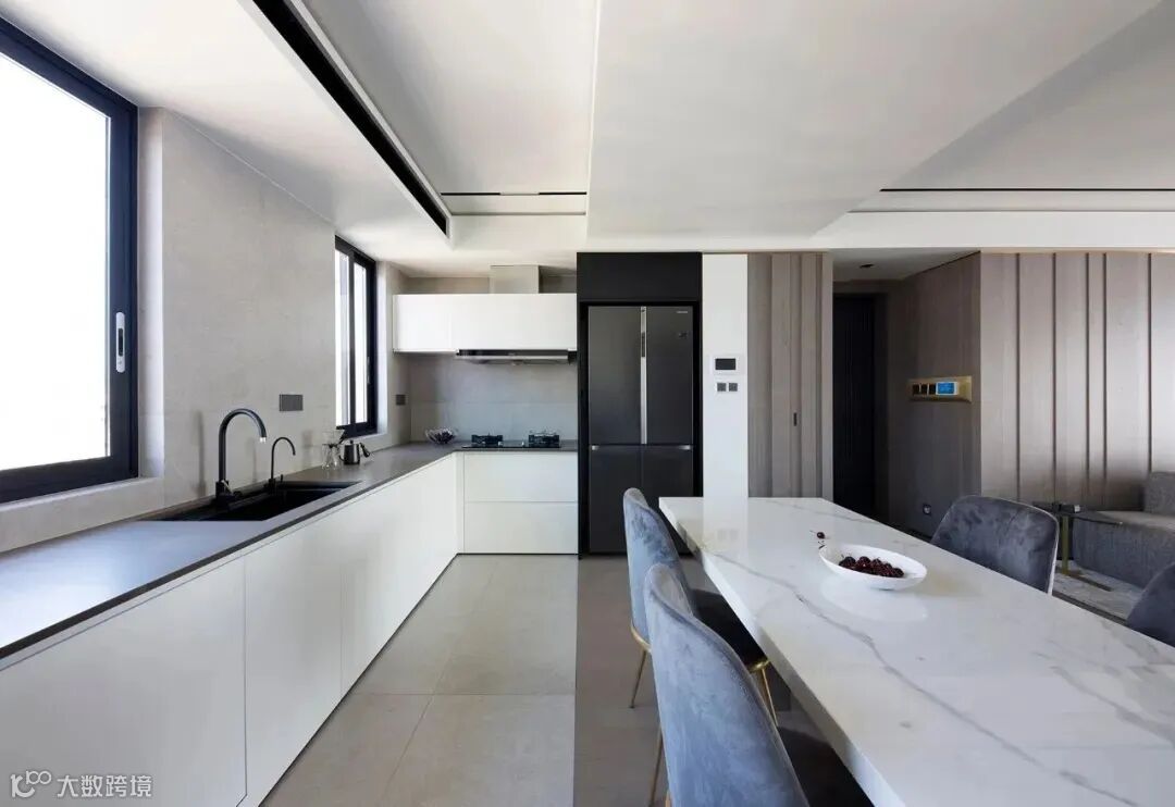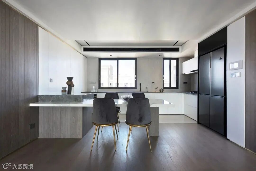 餐厅是家人情感的重要链接之处,设计师采用餐厨一体的设计手法,最大化利用空间,将餐厅与客厅一以贯之,增加空间的互动性。屋内光线通透,视线开阔,开启自在真实的休闲与用餐体验。