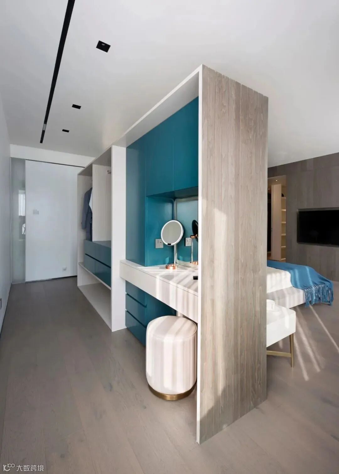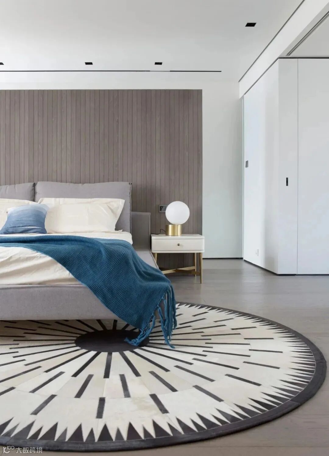 纯净感是主卧给人的第一感觉,空间以黑白灰为主色调,嵌入高贵的孔雀蓝,辅以金属家具搭配,体现出空间层次。黑白图案的圆形地毯使整个空间安静而不失温馨。