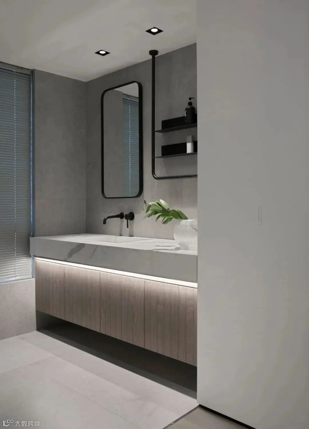主卫运用高级灰地砖与大理石台面,搭配木质柜体,凸显出高贵的气质,黑色的镜框与金属造型置物架,彰显主人对生活细节的品质要求。