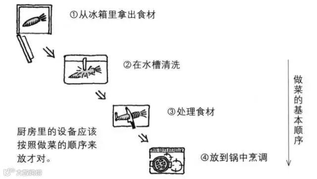②厨房动线根据烹饪顺序进行设计,冰箱——水槽——砧板——灶台。
