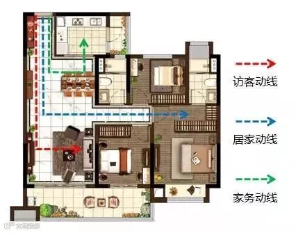 理解了动线的含义,我们来分析一下常见的三种家居动线:居住动线、家务动线、访客动线,避免交叉,按不同功能分割空间。