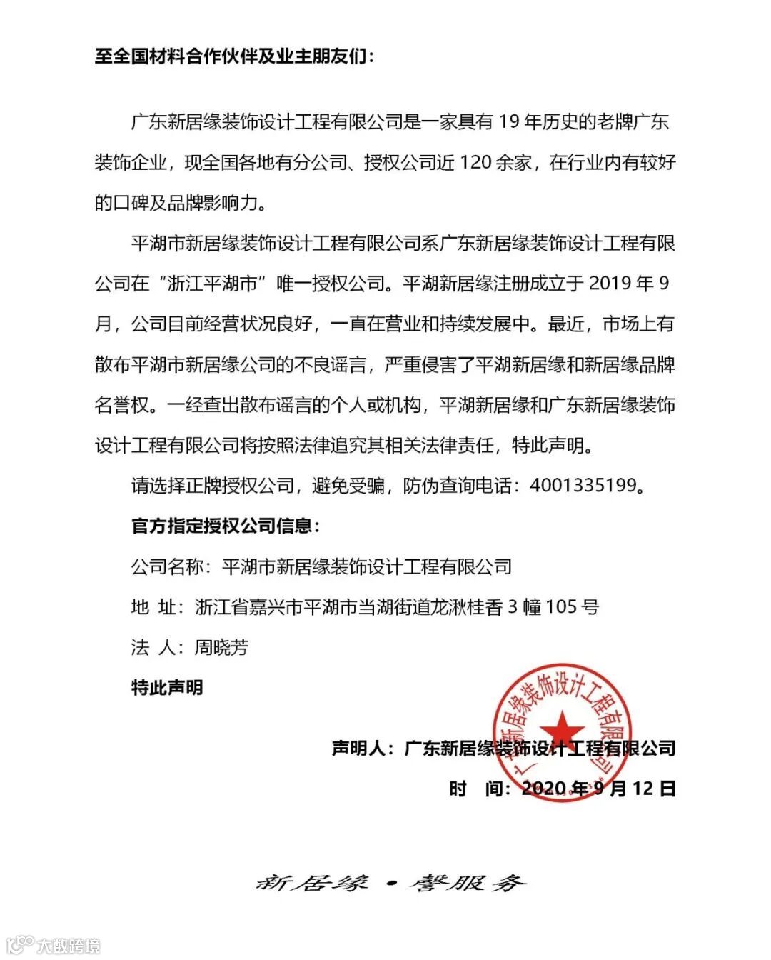 导读:最近,市场上有散布平湖市新居缘公司的不良谣言,严重侵害了平湖新居缘和新居缘品牌名誉权。一经查出散布谣言的个人或机构,平湖新居缘和广东新居缘装饰集团总部将按照法律追究其相关法律责任,特此声明。