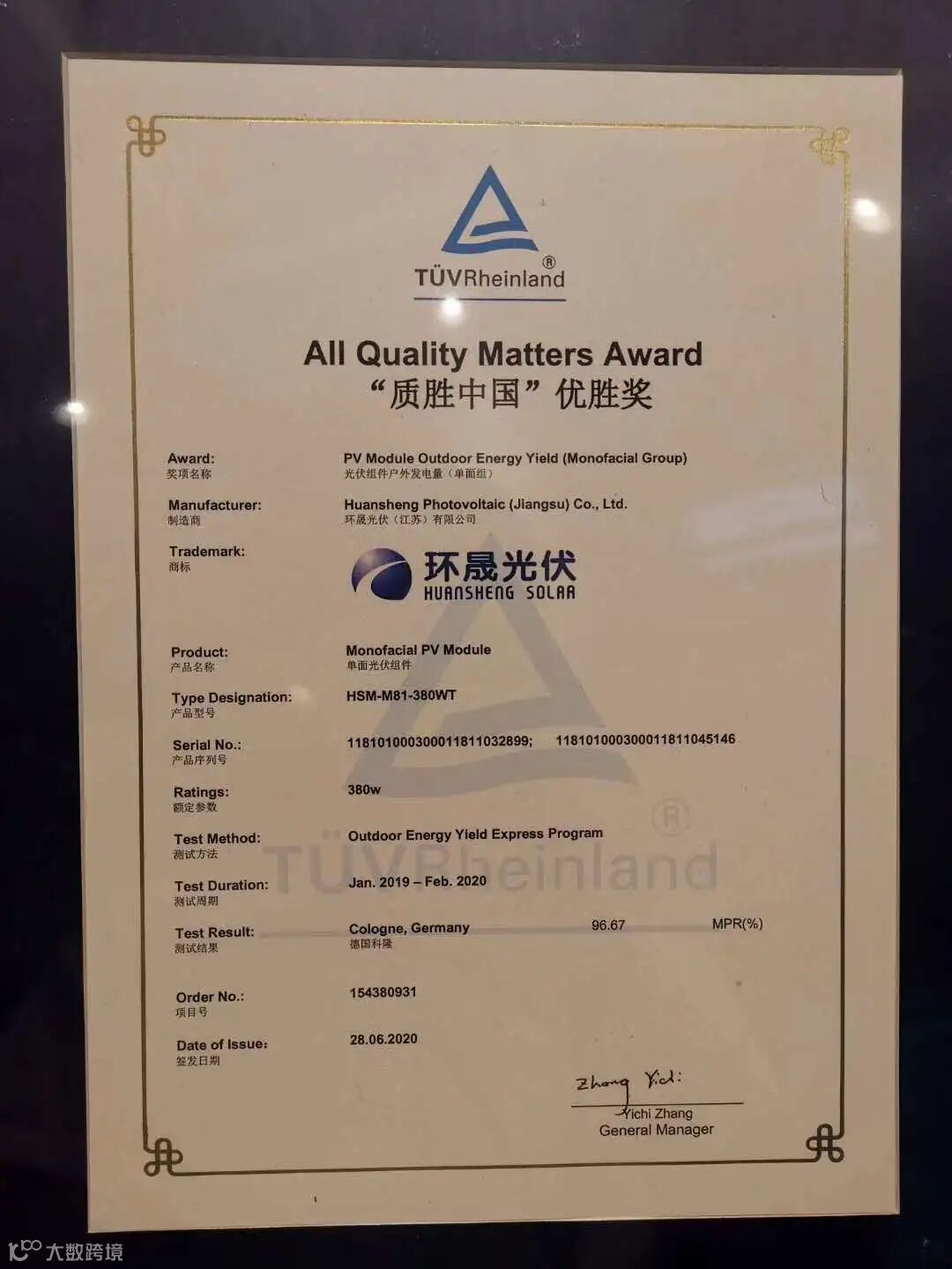 户外发电量对客户的价值不言而喻,作为一直坚持于为客户提供更高转换效率、更高可靠性、更高发电量产品的环晟光伏而言,此次殊荣,实至名归!