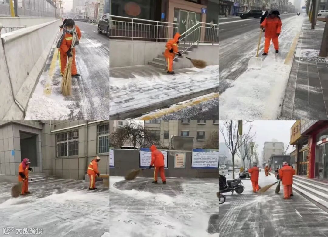 在主干道上,大型吹雪机和滚刷扫雪车轰鸣着向前推进,巨大的滚刷飞速转动,将厚厚的积雪迅速清扫到路边;环卫工人们手持铁锹和扫帚,对扫雪车无法清理到的角落和人行道进行细致清扫,确保路面无积雪、无结冰。在背街小巷和居民小区,环卫工人们同样不遗余力。他们用铁锹一锹一锹地铲除积雪,用扫帚一下一下地清扫路面,不放过任何一个卫生死角。他们一直坚守在岗位上,为居民创造安全、便捷的出行环境。